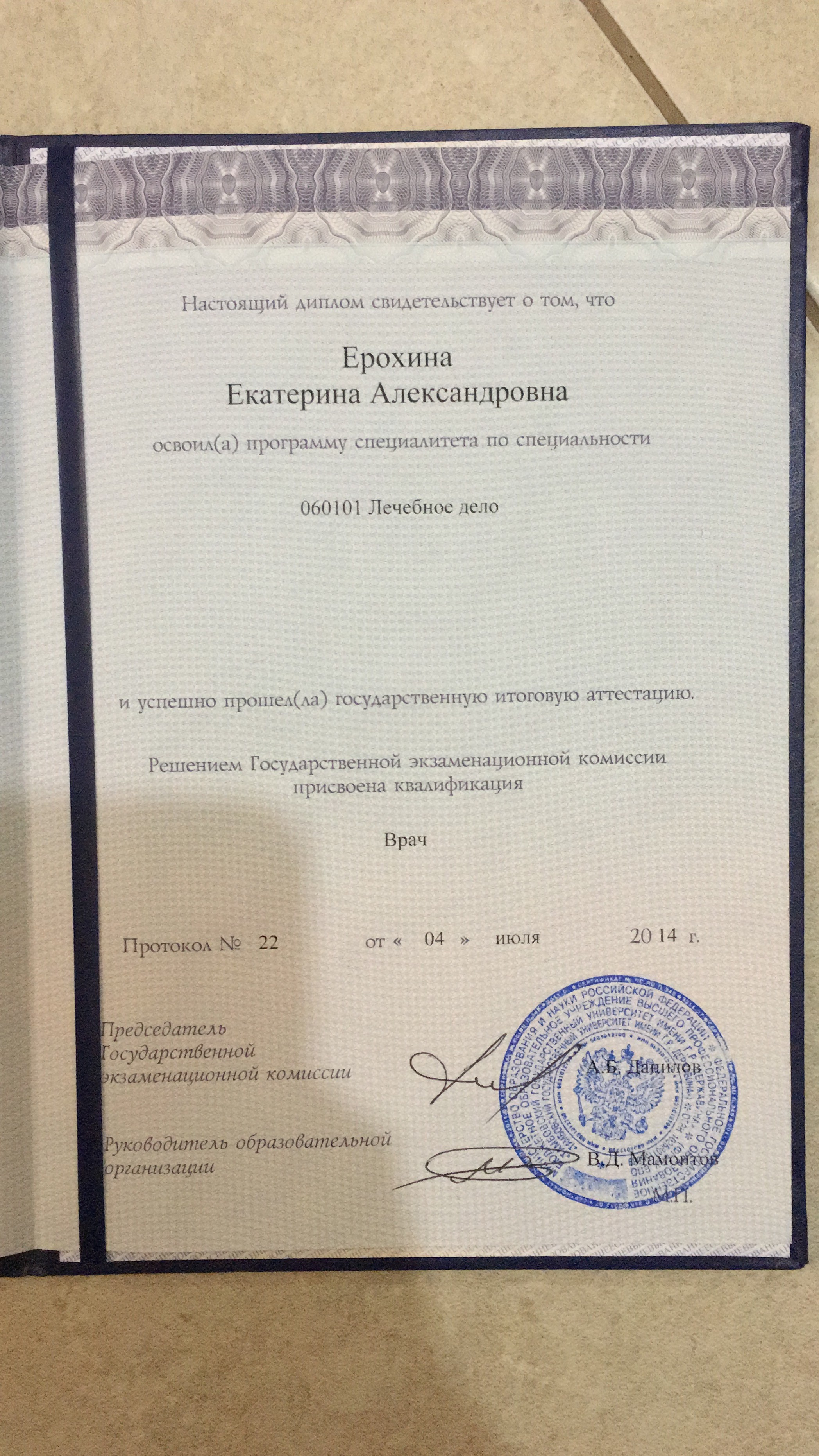 -Высшее медицинское образование, обучалась в ВГМУ им.Бурденко , ТГУ им.Державина, окончила интернатуру в 2015 году.